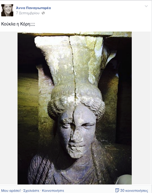 Mάλιστα σε πρόταση φίλου της στο facebook για τον τρόπο ενημέρωσης, απαντά «Το δελτίο τύπου που εκδιδεται από το ΥΠΠΟΑ συμβαδίζει απόλυτα με την πορεία της ανασκαφής. Θα ηταν μέγα επικοινωνιακό λάθος να κρατηθούν ευρηματα, όταν τα βλέπουν τόσοι ανθρωποι που εργάζονται εκεί. Κάποιος μπορεί να μιλήσει και να εκτεθούμε όλοι!»